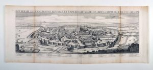 [Gravure]. [Topographie]. [Metz]. Pourtrait de l’ancienne royalle et imperialle ville de Metz capitalle du pais messin. A Paris chez Iean Boisseau, 1645. Une vue gravée sur cuivre, env. 28 x 73,5 cm., marges incluses 34 x 83,5 cm. (2 plis brunis dont un avec petite auréole). Très rare vue panoramique gravée de la ville de Metz, extraite du Theatre des citez, atlas publié par Jean Boisseau entre 1642 et 1648. Légende dans la marge sous la gravure. Numérotation manuscrite et trace d’onglet au verso. (Pastoureau, Les atlas français, Boisseau I, n° 13).