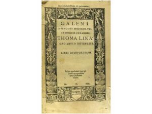 manuscritas y subrayados de anterior poseedor. Falto de los últimos 3 folios. Sin la enc. CCPB362282-7. Esta edición es la primera de la traducción de Linacre (1460?-1524) quien fue el primer y mas importante traductor de las obras médicas de autores griegos. Médico inglés, estudió en Canterbury, Padua y Oxford, a él se debe, en otras aportaciones, la fundación del Colegio de Médicos de Londres en 1518.