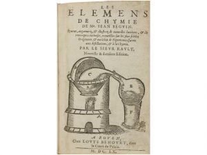 1660. (CIENCIAS). BEGUIN, IEAN: LES ELEMENS DE CHYMIE. A Rouen: chez Louys Behourt, 1660. 8°. 4 h. + 469 p., 23 h. Vinetas, capitales y cul-de-lampe. 1 lamina con un estado. Grabado en portada. Enc. de época en piena piel. Nervios, tejuelo y lomo...