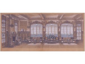 1910 ca. (ARTES DECORATIVAS). RUIZ: DOS DIBUJOS ORIGINALES PARA UN CONCURSO CONVOCADO POR EL AYUNTAMEINTO DE BARCELONA PARA DECORAR EL DESPACHO DEL ALCALDE. Barcelona. Lapiz de carbón y colores. 37x75 cn. cada original. Cada uno con sello...