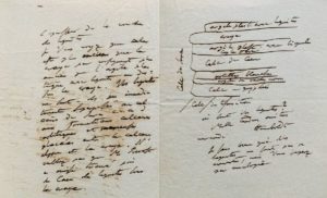 Alexander von HUMBOLDT (1769-1859), naturaliste et explorateur. Lettre autographe signée à un géologue [probablement Alexandre Brongniart]. 3 pp. in-16. Sans date [1822]. Très belle lettre sur les lignites, illustrée d'un croquis géologique. " Lisez, mon inestimable ami, une notice sur les forêts souterraines de Russie dans le nouv. Bibl. univ. Mars 1822 p. 174. Cela a beaucoup de rapports, ce me semble, à vos travaux. Auriez-vous la grâce de m'écrire 6 lignes seulement sur vos lignites pour mon tableau géologique. Je n'y puis consacrer que 6 à 10 lignes mais je voudrais savoir bien distinctement l'endroit et l'étendue que cela occupe, l'épaisseur de la couche des lignites. Si vous croyez que cela est plus ancien que la craie par conséquent plus ancien que l'argile plastique avec lignite au dessus la craye. Vos lignites ne sont-ils pas immédiatement superposés au calcaire du Jura et aux formations calcaires oolitiques et mameuses placées entre le calcaire alpin et la craye. N'oubliez pas que M. Prevost [le géologue Constant Prévost] a aussi trouvé près de Caen des lignites sous la craye ". Il illustre son propos d'un croquis géologique des différentes couches, et lui demande où il place ses lignites. " Je sais bien que vos lignites ne sont pas si courantes, mais vous jugerez par analogie ".