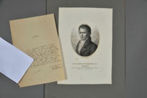 Alexander von HUMBOLDT (1769-1859), naturaliste et explorateur. Lettre autographe signée [probablement à la peintre Marguerite Gérard (1761-1837)]. 1 p. in-8. " Je suis infiniment sensible, Madame, aux marques aimables de votre intérêt et à la délicatesse du cadeau que vous avez bien voulu me faire. La gravure est très belle et rend fidèlement le tableau que je dois à la magnificence de mon illustre ami, Gérard. J'aurai l'honneur de passer chez vous [] ". [Le baron François Gérard réalisa plusieurs portraits d'Humboldt, dont l'un, très célèbre, fut gravé en 1832 par Charles Bazin]. Il est joint un portrait de Humboldt gravé par Ambroise Tardieu.