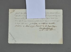 [MUSÉUM]. Gérard VAN SPAENDONCK (1746-1822), peintre de fleurs, attaché au Muséum (chaire d'iconographie naturelle, en 1793) ; il eut Redouté pour élève. Pièce autographe signée. 1 p. in-8 oblong. Paris, 4 mars 1793. Certificat de résidence au Muséum. " Gerard Van Spaendonck, peintre et dessinateur du Cabinet d'histoire naturelle et du Jardin nationale des Plantes, âge de quarante-cinq ans, demeure audit Jardin au-dessus de l'Orangerie depuis douze ans. Il a chez lui pour cuisinière Julie Amiel depuis une année, âgée de vingt-sept ans [] ".