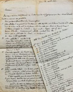 Claude SIONEST (ou SIONNEST) (1749-1820), malacologiste lyonnais ; il créa sa propre classification des mollusques et sa collection comptait une soixantaine d'espèces non répertoriées par Draparnaud. Lettre autographe signée accompagnée d'une note autographe. 2 pp. ½ in-4. Lyon, 21 avril 1802. Très belle lettre sur les mollusques. Claude Sionest a reçu la boite contenant les coquilles et cryptogames que son correspondant lui a fait parvenir. Il en fait l'analyse et lui livre ses conclusions. " 1° Helix albella. Il me paroit fort douteux que cette coquille qui se trouve dans le Midi et non dans le milieu ni le Nord de la France, soit bien celle que Linné a trouvée dans les montagnes escarpées de l'Alande ; ce qui vient à l'appui c'est sa couleur fauve et la carène blanche ; conséquemment albella voulant dire blanchette, blanche, je ne peux croire que ce soit celle de Linné. En conséquence, je lui donnerai comme Muller le nom d'hel. explanata. 2° Votre glabella ? mérite d'être examinée, je m'en occuperai au premier moment, et pour mon instruction, veuillez me dire si tous les individus sont constamment de cette grosseur ou si il en est qui acquièrent une plus grande dimension, car je possède un individu qui a le plus grand rapport avec la vôtre soit pour la forme et la petitesse, qui n'est cependant qu'un petit individu de la carthusianella, cette espèce varie ici depuis 3 lignes jusqu'à 7 de large [] ". 3° L'auricule myosote. Je l'avois reçue de Mr Draparnaud [] ". Il évoque ensuite les cryptogames de son herbier et dresse une liste de 23 coquilles qu'il lui adresse dans une boite, et fait quelques commentaires (1 p. ¼ petit in-4) : " [] Le pupa corrugata manque à ma collection. L'helix muralis, il est douteux que cette espèce hab. en France, je n'en ai qu'un seul individu trouvé parmi des coquilles marines []. "