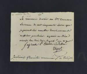 Jacques TRIPET (1749- ?), jardinier et fleuriste, il connut une grande réputation sous le Directoire et le Premier Empire pour ses tulipes ; en 1799, il montra, dans son jardin de la rue du Faubourg Saint-Martin, la plus belle collection de tulipes jamais vue en France ; en 1801, il y transféra ses jardins aux Champs Elysées. Fleuriste de l'Empereur, Joséphine fut la marraine de l'un de ses enfants. Pièce signée avec apostille autographe. 1 p. in-16. Paris, 10 nivôse an 3 [30 décembre 1794]. Mention ancienne d'identification à l'encre : " Jardinier fleuriste renommé pour les tulipes ". Reconnaissance de dette. Il reconnait devoir au citoyen Tronson [probablement l'avocat de Marie-Antoinette Guillaume Alexandre Tronson du Coudray (1750-1798)] la somme de 50 livres qu'il promet de rendre en messidor ". Très rare.