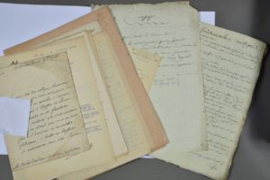 ALLIER. 17 documents XVIIIe-XIXe. - Lettre de M. de La Porte sur la fabrication d'étoffes de laine (Moulins, 1742). - 2 manuscrits sur la terre de Soupaize. Moulins, 25 fructidor an 10. 54 pp. in-folio au total. Signés par 4 conventionnels et députés : Joseph Jérôme Siméon (1760-1849), Jean Grenier du Puy-de-Dôme (1753-1841), Georges Antoine Chabot de l'Allier (1758-1819) et Guillaume Jean Favard de l'Anglade du Puy-de-Dôme (1762-1831). Procès-verbal de décision des jurisconsultes portant jugement sur la vente de la terre et seigneurie de Soupaize (Allier). - [Révolution]. Lettre désespérée du maire de Varenne au commandant de la " milice nationale de St Pourcin " lui demandant de venir au plus vite à 20 ou 25 " sur le champ et dans la plus grande diligence pour en imposer à une multitude qui depuis dimanche non contente de manger notre pain, boire notre vin, a enfoncé nos portes, et nous menace de pire ". - Manuscrit : " Note sur la chapelle du Mas 1854 ", signé " Comtesse Eulalie de La Rochette ". 2 pp. in-4. Château Du Mas (à Teillet-Argenty), 15 oct. 1854. - Lettre de la Supérieure du monastère de Moulins, 1880. Brevet de capacité pour l'enseignement primaire des filles (Moulins, 1822, signé par le baron de Talleyrand). Quittance de délivrance des eaux minérales de Vichy (1823, en partie imprimé). - Dossier provenant des archives de l'aviateur Maurice Bellonte qui, le premier, en compagnie de Dieudonné Costes, traversa l'Atlantique d'est en ouest. 4 lettres des aéro-clubs de Vichy et de Montluçon au sujet de l'invitation de Costes et Bellonte (1930-1931) + 1 double de réponse. - 4 lettres de personnalités natives de l'Allier : Émile Mâle (2 lettres du Palais Farnèse). Théodore de Banville (belle lettre à un peintre, avec réponse). Weyrauch (missions de Syrie à Yzeure). - lettre de l'entomologiste bourbonnais Ernest Devaulx de Chambord (Moulins, 1883).