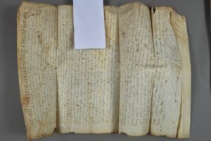 ARDÈCHE. Parchemin, 52 x 33 cm. 16 février 1551. Acte par lequel Louis de Bornes, seigneur de Laugières [Logères, paroisse de La Veyrune, Ardèche], permet à Benoit Brisson de Relothon, paroisse de la Verne, diocèse de Viviers, de faire une coupe de bois de futaie pour son chaussage, moyennant 10 livres tournois ".