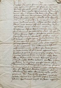 ARIÈGE. Manuscrit du XVe siècle. 3 pp. in-folio. En latin. Famille de Castelbajac. Copie d'époque d'une ordonnance de Charles VIII concernant Pierre de Castelbajac " nostra Petri de Castrobayaco " (mort à Pamiers en 1496), prononcée à Toulouse le 28 janvier 1496, puis promulguée par " Gasto de Castrobayaco [] senescallus vigorre " [Gaston de Castelbajac (v. 1470-1510), 16e sénéchal de Bigorre] à " Tarme " le 15 mars 1496. [Pierre de Castelbajac fut évêque de Pamiers en 1488 grâce au soutien de la comtesse de Foix, Catherine de Navarre, qui est également évoquée dans ce document " Catherina de fuxo Regina navarre & comtessa fuxi & Vigorre "].