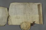 CALVADOS. Parchemin signé " Louis " (secrétaire de Louis XIII), 31 x 51 cm. Scellé par un très grand sceau en cire (brisé) pendant sur lacs de soie, contenu dans un étui en parchemin. Paris, août 1612. Mouillures. Confirmation de noblesse pour Philippe de Marescot " notre aimé et féal conseiller et général en notre cour des aydes de Normandie ", anobli par Henri IV en 1593, avec charge de " paier indemnités de soixante six escuz [] aux habitans de la paroisse d'Orbec [] ". Un second parchemin est scellé au premier confirmant l'anoblissement de Mre Philippe Marescot " enquesteur en la vicomté d'Orbec " (1597).
