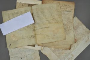 CALVADOS. 8 documents XVe-XIXe. Charte de 1490 (transaction faite à Pont-l'Evêque), lettres de tonsure signées par Aegidius de Haulte Bruyère (Bayeux, 1677), mandement de l'évêque de Bayeux Paul d'Albert de Luynes (parchemin, 1738), diplôme de l'Université de Caen pour Jacques-Pierre-Marie Guoymard de Kermorin (parchemin, signé, 1784), aveu du fief Patin au seigneur de Bourgeauville (cahier de parchemin, 11 pp. in-folio, 1635), parchemin émanant de la vicomté de Vire (1632), lettre signée par Achille Fould au sujet d'un projet de transaction d'alluvions maritimes détenus par les héritiers Leportier pour l'ouverture du canal de Caen à la mer (3 pp. in-folio, 1849), etc.