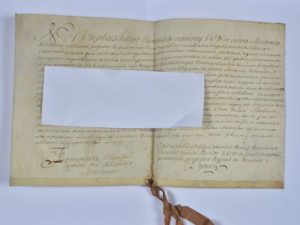 DOUBS. Pièce signée sur parchemin, 1 p. in-folio oblong. Grand ruban de soie (manque le sceau). Besançon, 23 février 1711. Diplôme de bachelier en droit de l'université de Besançon pour Charles Henry Joseph Maire [seigneur de Mondoré, Hurecourt, etc., futur conseiller-maître en la chambre des comptes de Franche-Comté].