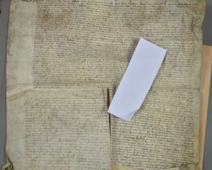 EURE. 2 parchemins attachés, du XVe siècle, 48 x 50 cm et 23 x 33 cm, le grand daté de 1456. Vicomté de Pont-Authou. Compilation d'actes de ventes de terres et de rentes concernant la seigneurie de la Coude, vicomté de Pont-Authou, et celle de Marcouville (le premier acte est datée de 1409). Fait devant Guillaume Leroux " Vicomte d'Ellebeuf ".