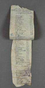 EURE. Manuscrit du XIVe siècle, sur deux feuillets de parchemin cousues, formant une bande de 40 x 10 cm. Tache et déchirures. Comptes pour la vicomté de Pont-Authou. " Cy ensuient les noms qui ont paié le fouage en la par. Goneville et la seigneurie de la Coude et la vicomté de Pontautou apporté par Gui. Hersant & Re. Regnaut ".