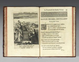 Livre D’emblèmes. - Terrier (Jean). Portraicts des.s.s. vertus de la Vierge contemplees par feue S.A.S.M. Isabelle Clère Eugenie infante d’Espagne. apin, de l’imprimerie de M. J. Vernier, 1635. In-4, (8)-166-(2 dont la dernière blanche) pp.,