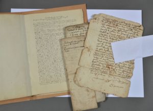 GARD. 14 documents XVIe-XVIIe. - Famille Moynier à Sommières et Aimargues. Cahier manuscrit contenant la copie d'actes anciens et 8 documents originaux du XVIIe montés sur onglet, concernant la famille Moynier. - Famille Salles à Sauve. 5 documents du XVIIe (achat d'un moulin, mariage, etc.). - Obligation de 1597 faite à Saint-André-de-Valborgne. Gard : voir également n°110 et 541