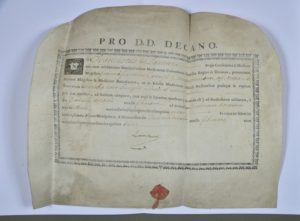HÉRAULT. Feuille de parchemin imprimée, avec lettrine et frise d'encadrement, arrondie aux angles supérieurs. Document complété à l'encre, signé par François de Lamure. Montpellier, 18 février 1769. Sceau manquant. Diplôme de bachelier en médecine de l'université de Montpellier, délivré à Jean-François Cavayé, de Carcassonne, pour ses travaux sur l'irrigation sanguine du cerveau : " cerebro late sanquo nirvis et corum usibus ". Cavayé sera médecin du roi aux colonies.