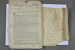 MARNE - CHAMPAGNE. 2 documents. - Permission de " tenir hostellerie " accordée en la généralité de Champagne, moyennant la somme de 785 " escuz soleil ", les fonds étant " destinés pour la construction du pont neuf de Paris ". Parchemin, 30 x 30 cm. 12 février 1582. - Affiche imprimée par ordre de l'intendant de Champagne, Charles-Etienne Le Peletier de Beaupré (Chalons, 5 mai 1731) : " Ordonnance du Roy pour faire faire par les intendants, ou ceux qui seront par eux commis, une revue générale des troupes de Milice ".