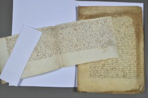 NIÈVRE. 2 parchemins. - Acquisition d'un jardin à Neuvy-sur-Loire fait " par madame douairière de Neuvy " auprès de " puissante dame Claude de Rochechouart ", et sa donation à l'hôpital de Neuvy. Cahier de parchemin manuscrit, 6 pp. ½ in-folio. Neuvy-sur-Loire, 6 mai 1594. - Acquisition faite devant Florimont de Dorne, seigneur de Sainte-Parize-en-Viry, d'une terre sise au finage de Tannay. 10 décembre 1601.