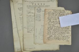 HAUTE-SAÔNE. 7 documents manuscrits en partie imprimés. Vesoul, 15-28 thermidor an 2. Dossier sur la vente des biens de l'émigré " Reud dit Valdener " de Vesoul : 3 expéditions de procès-verbaux d'adjudication (15 pp. in-folio) et 4 récépissés de vente d'immeubles (6 pp. in-4). On joint 5 lettres de Deckhard, de Vesoul, 1790-1793, au sujet de la demoiselle Le Guay de Villiers " malheureuse qui meurt de faim et que la misère poignarde ", 8 pp. in-4.