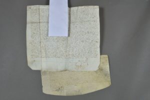 SARTHE. Parchemin. Daté du 23 juin 1491. Vente par Julien de La Barre demeurant au bourg de Beaumont-de-la-Chartre d'une pièce de terre " estant en landes et pastures " sise en la paroisse d'Espaigne à Courcillon, détenue par héritage de " hault et puissant seigneur monseigneur Anthoine sire de Bueil conte de Sancerre baron de chasteaux en Anjou seigneur d'Espaigne ". On joint un aveu pour la métairie des Souardières (1607).