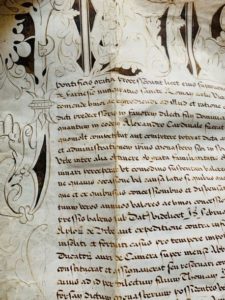 HAUTE-SAVOIE. Grand parchemin, 77 x 55 cm, en-tête calligraphié et ornementé de dessins à la plume, y compris dans la marge gauche. Rome, 1549 [1550], première année du pontificat. En latin. Sans le sceau. Précieuse bulle pontificale de Jules III pour de l'Abbaye d'Abondance, au sujet du transfert à Claude de Blonay, nouvel abbé commendataire de l'abbaye, par son prédécesseur Dominique Ciclati, d'une pension de 100 ducas d'or. Claude de Blonay fut abbé d'Abondance de 1550 à 1574 ; il a reconnu 4 fils.