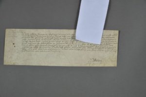 PARIS. Pièce signée par Jehan Pellerin, avocat au châtelet de Paris. 10 x 30 cm. Paris, 14 octobre 1525. Droit du pied fourché sur les marchés de Paris au temps de François 1er. Il confesse avoir reçu " le revenu des fermes du piedfourche [droit du pied fourché, taxe sur les bovins, ovins et porcins dues au roi] vendu en ladit. ville fauxbourgs et marchés de Paris [] ".