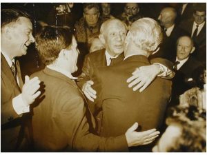 11 FOTOGRAFIAS DE PABLO PICASSO EN COMPANIA DE VARIAS PERSONALIDADES FAMOSAS COMO LUIS MIGUEL DOMINGUIN O JEAN COCTEAU. 18x24 cm e inferiores. Varias de las imagenes se tomaron en su casa de Notre Dame de Vie en Mougins.