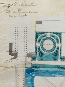 SEINE-ET-MARNE. Plan manuscrit aquarellé, fin XVIIIe-début XIXe. 30 x 23 cm. " Château de Fontainebleau - plan d'une partie de l'avenue côté de la grille ", comprenant un projet de nouvelles plantations, entre le pavillon des gardiens et les écuries du Carrousel. Document provenant des archives du peintre Antoine-Laurent Castellan (1772-1838) qui fit d'importants travaux d'étude sur Fontainebleau, publiés en 1840 avec 85 eaux-fortes : Fontainebleau. Études pittoresques sur ce château, considéré comme l'un des types de la renaissance des arts en France au XVIe siècle. [voir lot n°434]