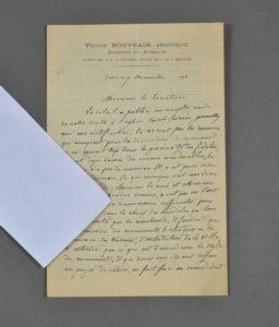 Victor BOUVRAIN (1832-1908), architecte. Lettre autographe signée, 1 p. ½ in-8, à son en-tête. Paris, 7 novembre 1893. Sur la décoration de l'église Saint-Séverin. Il s'offusque de la direction qui est prise. " Ce ne sont pas les ressources qui manquent pour la décoration du monument, on ne saurait trop louer la générosité des fidèles, ils ont déjà donné des sommes considérables ; la fabrique n'a pas de ressources et n'est pour rien dans les dépenses. Ce qui manque, c'est une direction, un guide. Monsieur le curé et messieurs Delante et Gondré vicaires, n'ont pas sur l'art et le style, des connaissances suffisantes pour les éclairer dans le choix des modèles qui leur sont présentés par les marchands. Il faudrait que la commission des monuments historiques ou la commission des travaux d'architecture de la ville, n'autorise que ce qui est d'accord avec le style du monument. Il y a deux ans ils ont refusé un projet de chaire, en ont fait faire un second, dont ils ont autorisé l'exécution. Ne pourrait-on pas faire de même pour les autels et les vitraux [] ".