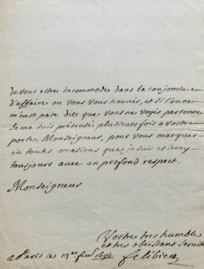 Jean-François FÉLIBIEN (Chartres 1658-1733), architecte, historiographe du Roi, secrétaire de l'Académie Royale d'Architecture, auteur de nombreux ouvrages d'architecture. Lettre autographe signée à " Monseigneur ". 2 pp. in-4. Paris 13 fév. 1696. Très rare lettre. " Mons. De La Hire m'a fait voir par la quittance qu'il m'a montrée de Mons. Lefevre que sa capitation suivant la taxe qu'il a eue comme Professeur de l'académie d'architecture est entièrement payée dès le 14e du mois de janvier dernier. J'eusse esté moy mesme, Monseigneur, vous faire ce raport si je n'eusse appréhendé de vous estre incommode dans la conjecture d'affaires où vous vous trouvés, et si l'on ne m'eust pas dit que vous ne voyés personne. Je me suis présenté plusieurs fois à vostre porte [] ".