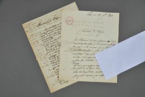 Jean-Baptiste RONDELET (1743-1829), architecte. 2 lettres signées à Claude-Etienne Delvincourt (1762-1831), doyen de la faculté de Droit de Paris. 4 pp. in-4. Paris, 1818-1819. Adresses au dos. Cachet de la collection Paul Fontaine. Sur la démolition d'une maison jouxtant l'École de Droit. Il a effectué une nouvelle visite de la maison de la rue Saint-Etienne et reconnaît qu'elle périclite de plus en plus. " Les effets se manifestent chaque jour par la désunion des carrelages, et des craquements continuels que les personnes qui habitent disent entendre toutes les nuits ". Compte tenu du coût que nécessiterait une réhabilitation, il est partisan de la démolition. La seconde lettre concerne le mur de séparation de la maison démolie. Il propose de le démolir et de réunir le terrain de la cour à celui du jardin, d'y pratiquer une ouverture avec porte, " de sorte qu'au moyen de ces arrangements, il n'y ait aucune communication entre les habitants de la petite maison qui touche immédiatement l'école et la cour ou le jardin de la maison occupée par Mr Boulange ". Il propose également que l'on ouvre une communication entre ladite maison et l'école, " une porte débouchant dans la galerie de gauche de l'école pour remplacer celle qui débouche dans l'autre galerie, puisqu'au moyen de cette porte on ne serait plus obligé de traverser la cour [] ".