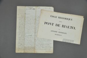 Antoine Jean-Baptiste RONDELET (1785-1863), architecte, inspecteur puis architecte du Panthéon. Lettre autographe signée [à l'éditeur Bance]. 4 pp. in-4. Paris, 9 juillet 1839. Longue lettre toute consacrée à l'étude critique du Traité de l'art de la charpente de Jean-Charles Krafft, paru la première fois en 1821 et dont son correspondant prépare une nouvelle édition. " Conformément aux ouvertures que vous avez bien voulu me faire au sujet de la nouvelle édition de la charpente de Krafft, que vous vous proposez de publier, j'ai jeté un nouveau coup d'oeil sur cet ouvrage, et j'ai l'honneur de vous soumettre les réflexions que cet examen m'a suggéré ". Il développe longuement en 12 points, les fruits de son analyse.