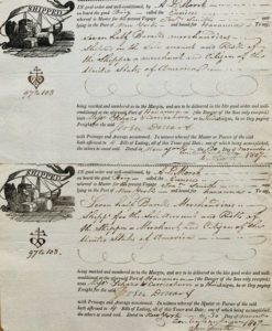 CONNAISSEMENTS MARITIMES. Collection de 40 connaissements XVIIIe-XIXe, contenus dans un classeur, certains ornés d'une belle gravure. Bel ensemble de connaissements anglais, espagnols, hollandais et français, classés chronologiquement de 1776 à 1839, concernant principalement le commerce entre Cuba et l'Amérique, et le commerce transatlantique (bon nombre sont établis à La Havane) : voyages de Marseille à Saint-Pierre de Martinique (1784), de New York à La Havane (1807, productions américaines), La Havane à New York (plusieurs de 1807, sucres blancs et roux), La Havane à Saint-Thomas (1807, sucres), La Havane à la Nouvelle Orleans (1805, sucres), Saint-Thomas à La Havane (1806), La Havane à Boston (1811), La Havane à Baltimore (1811), La Havane à Londres (1811, indigo et cochenilles), etc.