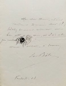 CURIOSITÉ. Lettre illustrée du dessin d'une araignée. 1 p. in-8. Lettre de la fin du XIXe, datée " vendredi 13 " et signée " La Bête ", illustrée du dessin d'une araignée. " Tachez de nous réserver un bon petit coin où il n'y ait pas pourtant d'[araignée] ".