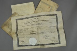 DIPLOMES. 4 diplômes de bachelier du début du XIXe, sur parchemin. - 2 diplômes de bachelier es-lettres (1810) et bachelier en droit (1811), signées par Fontanes, grand maître de l'Université, décernés aux fils du conventionnel du Lot, Barthélemy ALBOUYS : l'un pour François-Georges-Michel Albouys (Cahors 1788-1838) futur magistrat et homme de lettres, l'autre pour Jean-Georges Albouys (né à Cahors en 1793). Sceau sous papier à l'aigle impérial. - Diplôme de bachelier es-lettres pour François Ducos natif de Tarbes (1788), signé par Royer-Collard (1819). - Diplôme de bachelier es-lettres pour Henri-Maurice Valicon, natif de Haute-Loire (1817), signé par Guizot (1837).