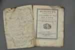 PAPIER DOMINOTÉ DU XVIIIE. Papier dominoté XVIIIe à décor de panthère dans un univers végétal et floral, servant de brochure à Discours prononcé dans l'hôtel de ville de Lyon le 21 décembre, fête de S. Thomas, de l'année 1741, par M. Michon, écuyer, fils de M. Michon, avocat du Roi, au bureau des Finances de Lyon (Lyon, imprimerie d'Aymé Delaroche, 1740). In-4, 24 pp. dans un encadrement. Mouillures dans les coins