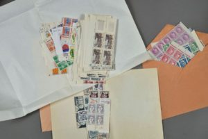 TIMBRES NEUFS DE FRANCE EN BLOCS DATÉS. Ensemble de timbres des années 1950 conservés en blocs de 4 timbres avec la date imprimée dans la marge. Au total 125 blocs de 4 timbres. On joint deux autres enveloppes de timbres neufs.