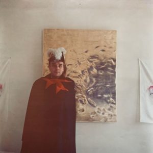 [Yves KLEIN]. Harry SHUNK & Janos KENDER. Yves Klein en chevalier de Saint-Sébastien devant Ci-git l'Espace RP3, 1960. Tirage photographique d'époque en couleurs. 30,5 x 30,5 cm. Superbe photo vintage réalisée en 1960 dans son atelier du 14 rue Campagne-première. C'est cette photographie qui servit de couverture au catalogue de l'exposition Klein à Pompidou en 1983.