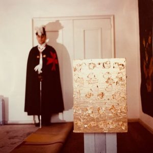 [Yves KLEIN]. Harry SHUNK & Janos KENDER. Yves Klein en chevalier de Saint-Sébastien devant son Monogold MG20, 1960. Tirage photographique d'époque en couleurs. 30,5 x 30,5 cm. Superbe photo vintage réalisée en 1960 dans son atelier du 14 rue Campagne-première.