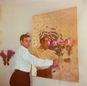 [Yves KLEIN]. Harry SHUNK & Janos KENDER. Yves Klein avec Ci-git l'Espace RP3, 1960. Tirage photographique d'époque en couleurs. 30,5 x 30,5 cm. Superbe photo vintage réalisée en 1960 dans son atelier du 14 rue Campagne-première.