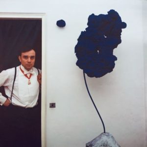 [Yves KLEIN]. Harry SHUNK & Janos KENDER. Yves Klein avec sa sculpture éponge SE167, 1960. Tirage photographique d'époque en couleurs. 30,5 x 30,5 cm. Superbe photo vintage réalisée en 1960 dans son atelier du 14 rue Campagne-première.