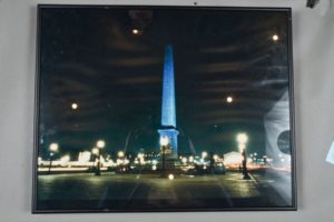 ILLUMINATION DE L'OBÉLISQUE. Photographie originale en couleurs, 40 x 50 cm. [1983]. Légèrement gondolée. Encadrée. Grande photographie représentant l'illumination en bleu de l'Obélisque de la place de la Concorde, oeuvre conceptuelle réalisée le 1er mars 1983 pour marquer l'inauguration de l'exposition rétrospective d'Yves Klein au centre Georges-Pompidou [l'artiste avait imaginé ce projet à l'occasion de l'exposition chez Iris Clert le 28 avril 1958, mais la préfecture avait annulé l'autorisation au tout dernier moment]. Cette photographie est prise d'un angle différent de la carte postale officielle, avec en perspective non pas les Champs-Élysées mais le Palais Bourbon. On joint une carte postale représentant cet événement, éditée par les Amis du Musée d'art moderne de la ville de Paris.