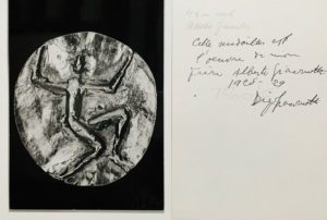 Diego GIACOMETTI. Pièce autographe signée, 16 x 11 cm. Certificat pour une oeuvre de son frère Alberto Giacometti. Au dos d'une photographie représentant une médaille d'Alberto : " Cette médaille est l'oeuvre de mon frère Alberto Giacometti 1928-29. Diego Giacometti ". Il est joint 2 photographies représentant recto-verso le document, et une troisième, plus grande, d'un dessin d'Alberto Giacometti.