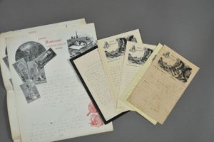 Jules ADELINE (Rouen 1845-1909), dessinateur rouennais. 10 lettres autographes signées à John Grand-Carteret, avec beaux en-têtes gravés. 14 pp. in-8 et in-4, d'une fine écriture. Rouen, 1885-1888. Belle correspondance sur leur collaboration, en particulier pour L'Art et la brasserie (1886). Dans une longue lettre, Jules Adeline passe en revue tous les brasseries décorées de Rouen. " Ceci dit, voici ce qu'on trouve à Rouen de cafés avec décorations plus ou moins artistiques, plutôt moins que plus. - Café Sallès. Place du vieux marché, près le Théâtre Français. Les dessus de porte, les dessus de glaces sont remplis de petites toiles représentant les principaux personnages des Bibelots du diable. Ces toiles ont été peintes par Lacombe alors au Théâtre de Rouen, qui depuis a été à la Renaissance, au Palais royal, etc. Ces peintures exécutées vers 1860 environ et passablement enfumées ont été réparées par M. Goulon il y a peu de temps. - Café Victor. L'un des cafés modèles ! du Rouen moderne, tentures à reflets mordorés, plafond en mosaïque avec bronzes et feuillages repoussés et médaillons allégoriques [] ". 11 cafés rouennais sont ainsi détaillés dans cette première lettre.