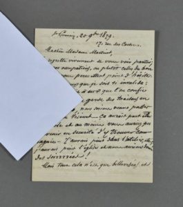François BONVIN (1817-1887), peintre de genre et de natures mortes, il peignit de manière admirable les milieux modestes dont il est issu. Lettre autographe signée à Madame Martinet. 3 pp. in-12. Saint-Germain, 20 novembre 1879. Il regrette son départ. " Il est fâcheux que je sois si invalide : quoique ce soit à eux que l'on confie ordinairement la garde des maisons en construction, nous serions venus passer l'hiver au Vésinet - ça aurait peut-être été drôle et au moins vous auriez pu y revenir en sécurité et y trouver compagnie. J'aurais peint dans l'atelier, et j'aurais peint l'église et nous aurions donné des soirrrrées ! Mais tout cela n'est que billevesées et le réel, c'est l'horrible maladie qui m'assassine à petit feu et à grandes inflammations avec des douleurs inouïes pour musique ! J'espère que votre opéra marche mieux que moi, qui ne peut presque plus []. Je n'ai jamais trouvé, depuis que nous y avons diné, une accalmie dans ma triste souffrance pour aller rendre visite à vos amies, que nous aimons toujours beaucoup plus que leur fastueux festin ; mais si je ressuscitais, le premier emploi de ma santé serait d'aller la risquer de nouveau pour leur témoigner la sympathie que nous éprouvons pour elles [] ". Rare.