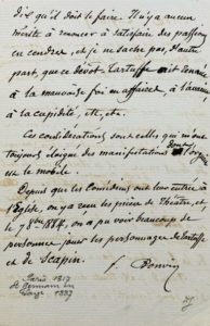 François BONVIN (1817-1887), peintre de genre et de natures mortes, il peignit de manière admirable les milieux modestes dont il est issu. Pièce autographe signée 2 pp. in-8. [1884]. Dénonciation pour immoralité. " Parmi les personnages qui figurent au banquet donné à propos du cinquantenaire de l'excellent curé Chauvel, de St Germain, se trouve M. Eugène Seure, le plus indigne, par ses moeurs, de figurer en si haute compagnie religieuse. Il est des gens qui n'ont le respect de rien, pas même de leurs vices : il n'était point le seul d'ailleurs, à cette cérémonie, et si le bon curé se doutait des sources diverses d'où on a tiré les frais du présent qui lui a été offert, il ne trouverait certainement que de la lie à boire dans le calice ! Quand, passé trente ans, un pêcheur ne s'est point repenti, ce n'est pas à soixante-dix qu'il doit le faire. Il n'y a aucun mérite à renoncer à satisfaire des passions en cendres, et je ne sache pas, d'autre part, que ce dévot-Tartuffe ait renoncé à la mauvaise foi en affaires, à l'avarice, à la cupidité, etc., etc. Ces considérations sont celles qui m'ont toujours éloigné des manifestations dont l'orgueil est le mobile. Depuis que les comédiens ont leur entrée à l'Église, on a reçu les pièces de théâtre, et, le 7 8bre 1884, on a pu voir beaucoup de personnes jouer les personnages de Tartuffe et de Scapin ".