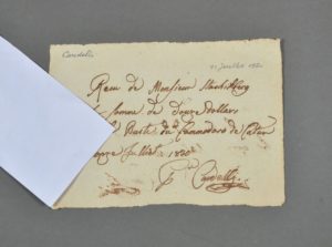 Pietro CARDELLI (1776-1822), sculpteur italien ; il eut une carrière américaine très importante, travailla au Capitole (à partir de 1818), sculpta le fronton du Cabildo à la Nouvelle-Orléans, et eut le privilège de sculpter les bustes d'après nature de trois présidents américains (Jefferson, Madison et Monroe). Pièce autographe signée. 1 p. in-8 oblong. 11 juillet 1820. " Reçu de Monsieur Staehilberg la somme de douze dollars pour le Buste du Commodore de (Catur ?) le onze juillet 1820 ". Rare.