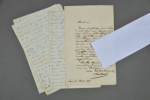 Antoine CHINTREUIL (1814-1873), peintre paysagiste, lié à l'École de Barbizon, précurseur des impressionnistes. 4 lettres autographes signées à un collectionneur et mécène. Paris, Igny, Latournelle par Septeuil, 1853-1869. 11 pp. in-8. Superbe correspondance artistique. " Depuis longtemps, j'avais le désir de vous offrir une esquisse. Je n'osais le faire, j'étais effrayé de votre réputation de connaisseur si distingué : mais la lettre bienveillante que vous avez adressée à monsieur Béranger me donne l'espoir que vous voudrez bien me faire l'honneur d'accepter mon oeuvre, et d'être indulgent pour une peinture encore nouvelle et peu appréciée aujourd'hui []. Faites-moi vos observations en fait d'art, je ne m'en fiche pas comme vous dites, rien n'est plus bête qu'un paysagiste et il apprend toujours à écouter les fins observateurs comme vous, même lorsqu'il aime mieux le talent de Chintreuil au détriment du grand Coro [Corot] ou de l'indépendant d'Obigny [Daubigny]. J'attendais pour vous répondre de nouveaux dessins promis, comme ils ne viennent pas et pour ne pas vous faire demander tous les jours si le facteur est arrivé []. Nous travaillons beaucoup mon cher ami Desbrosses [Jules-Alfred] fait des chef-d'oeuvres et je veux bien vous promettre des documents sur son compte pour la biographie que vous ne pouvez plus vous dispenser de faire pour sa gloire et pour la vôtre []. L'art n'existe plus, le gouvernement ne pense qu'à mendier, tirer de l'argent des citoyens, voilà son but [], mais voulez-vous ses encouragements, voici la recette : faites des comédies excitant les individus à se manger les uns les autres, faites de la peinture pour amuser les cabinets comme ils disent, c'est à dire de sales tableaux, ou bien de la peinture officielle bataille bataille, généraux, canard impérial, à ce point de vue, vous serez à leurs yeux un grand artiste, mon cher ami []. Chassons le mauvais temps, voici le ciel bleu, j'ai trois tableaux pour le Salon prochain, un champ de Sainfoin (bon tableau) qui sera refusé (probablement), un effet du matin (bon) refusé à coup sûr et enfin un automne ni bon ni mauvais reçu probablement. Quant à Desbrosses, je ne veux pas vous faire la description de ses tableaux pour le forcer à vous écrire []. Je suis si souffrant et si dégoûté de la vie, si j'étais seul, et si je n'avais pas d'ami, je crois que je serais déjà parti pour le grand voyage []. Je suis absorbé par mon diable de paysage qui ne me laisse aucun repos []. Le ministère des beaux-arts a fait l'acquisition d'un de mes tableaux du salon intitulé les ruines soleil couchant (c'est un souvenir de chez vous), ce sont les ruines de l'ancien château de Boves. Vous voyez qu'elles m'ont porté bonheur, du reste le tableau était bon, il faut croire que j'ai l'estomac reconnaissant, car nous parlons souvent avec ce bon Desbrosses des excellents potages de chez vous et de ces belles et bonnes friandises que madame savait si bien faire [] Le salon n'est ni bon ni mauvais mais il n'y a pas d'oeuvre saillante. Desbrosses a 2 tableaux dont un est fort original, c'est un cabaret de village où il y a un clair-obscur très réussi mais il fait horreur à quelques membres de l'Institut. L'autre tableau est intitulé la convalescence, c'est une bonne et forte peinture [] ".