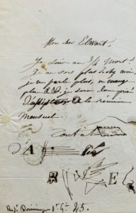 Antoine-Laurent DANTAN (1798-1878), dit Dantan l'aîné, sculpteur. Lettre autographe signée au compositeur Antoine Elwart. 1 p. in-8. [1841]. Déchirure avec tout petit manque en marge. Adresse au dos avec marques postales. Amusante lettre en partie écrite sous forme de rébus (dont la signature). " Je suis au ¾ mort. Je ne sors plus de chez moi. Je ne parle plus, ne mange plus, etc., etc. Je serai donc privé d'assister à la réunion mensuelle ". Puis sous forme de rébus : tout à toit d'A mi tié. Dent temps É nez.