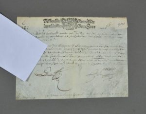 Charles Antoine HÉRAULT (1644-1718), peintre de paysages et de portraits. Pièce signée. 1 p. in-8 oblong sur parchemin. Paris, 30 septembre 1697. Étiquette et bande de papier collée au dos. Reçu de 50 livres comme " peintre ordinaire du Roy en son académie Roalle de peinture et sculpture ". Très rare.